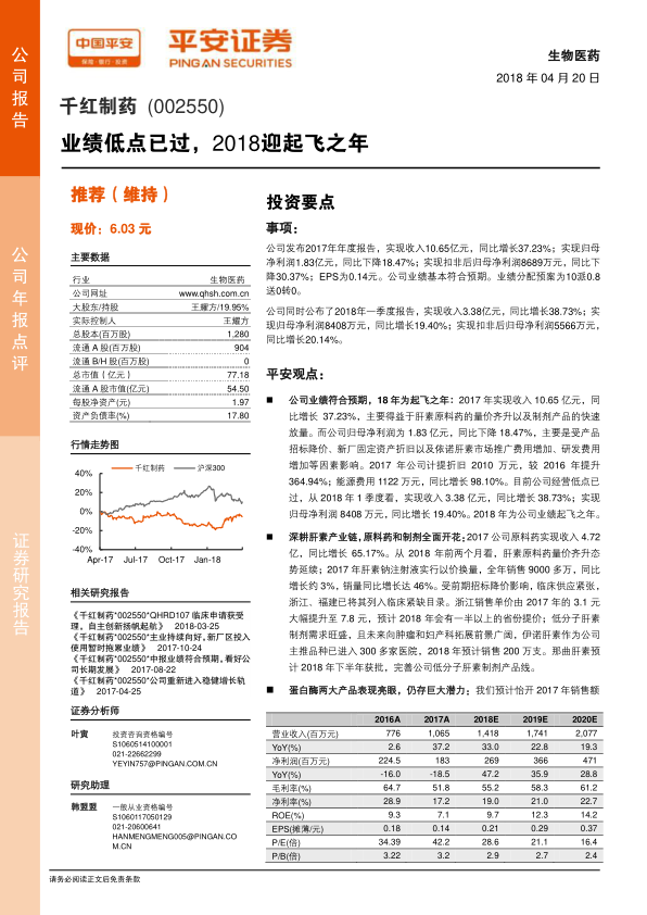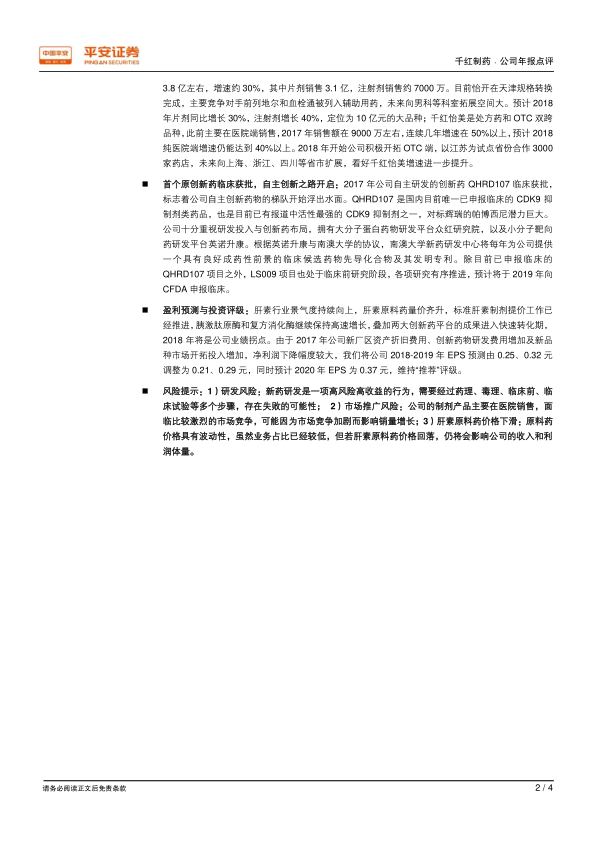 千红制药在2017年经历业绩低谷后,2018年有望迎来业绩的显著增长。公司在肝素产业链、蛋白酶产品以及创新药研发方面均有布局,未来有望在多个领域实现突破。平安证券维持对千红制药的“推荐”评级,但同时也提示了研发风险、市场推广风险以及肝素原料药价格下滑等风险因素。