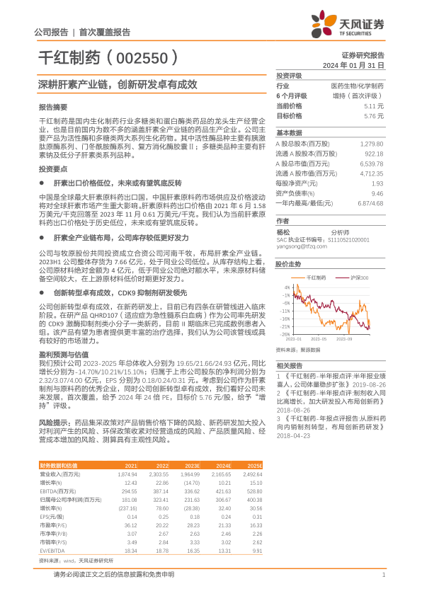 基于上述分析,报告对千红制药的盈利进行了预测。预计公司2023-2025年总体收入分别为19.65/21.66/24.93亿元,同比增长分别为-14.70%/10.21%/15.10%;归属于上市公司股东的净利润分别为2.32/3.07/4.00亿元,EPS分别为0.18/0.24/0.31元。采用可比公司估值法,考虑到公司作为肝素制剂与原料药的优秀企业以及创新转型卓有成效,给予2024年24倍PE,目标价5.76元/股,并首次覆盖给予“增持”评级。