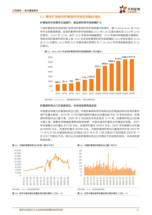 全球人口老龄化、慢性病和心血管疾病发生率的增加,以及肥胖人群规模的增长和新兴市场医药需求的提升,共同推动了抗凝血剂/抗血栓市场的持续扩张。根据Frost&Sullivan的预测,全球肝素制剂市场规模将从2019年的47.49亿美元增至2025年的65.45亿美元,年均复合增长率为5.5%。受下游制剂市场需求拉动,全球肝素原料药市场规模也稳步增长,预计2025年将达到33.18亿美元,2019年至2025年的复合增长率预计为17.5%。中国肝素原料药出口价格在2021年6月达到1.58万美元/千克的高点后,回落至2023年11月的0.61万美元/千克,目前处于历史相对低位,报告认为未来有望筑底反转。值得注意的是,生猪价格与肝素原料药出口价格在2021年以来并未呈现显著相关性。