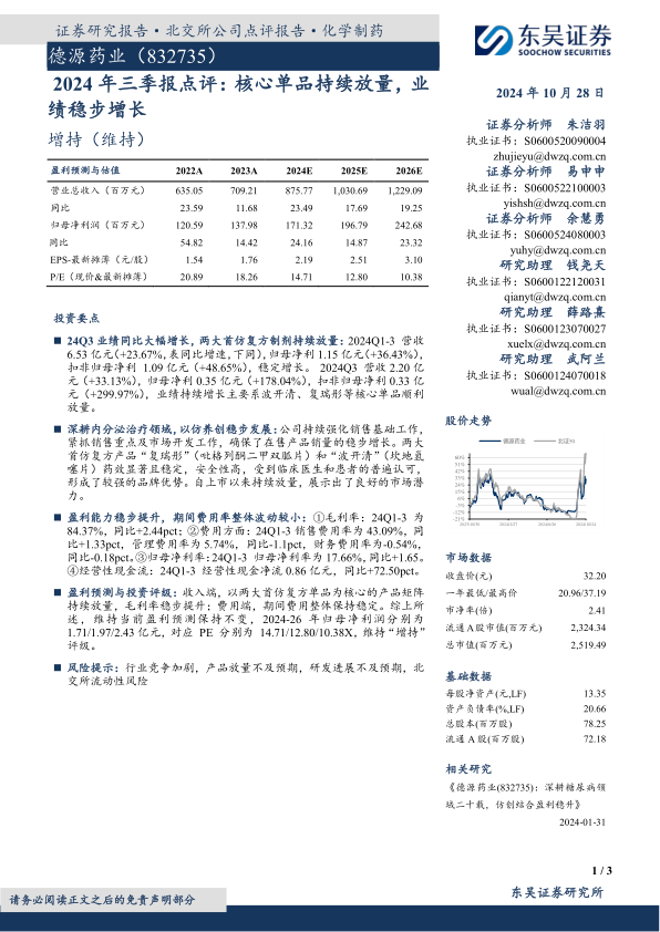 德源药业2024年三季报表现亮眼,核心单品持续放量推动业绩大幅增长。公司在内分泌治疗领域深耕细作,以仿养创模式稳步发展,盈利能力持续提升。维持对公司未来盈利的乐观预测和“增持”评级,但同时也提示了行业竞争、产品放量、研发进展以及北交所流动性等风险。