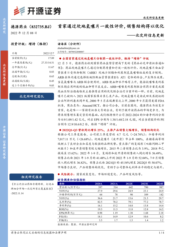 12 月 5 日,德源药业收到国家药品监督管理局下发的《药品补充申请批准通知书》: 药品坎地氢噻片已通过仿制药质量和疗效一致性评价。 坎地氢噻片由血管紧张素Ⅱ受体抑制剂(ARB)坎地沙坦酯和利尿剂氢氯噻嗪组成的复方制剂。ARB 在体内通过选择性地阻断血管紧张素Ⅱ与 AT1 受体的结合, 产生降压效果。当氢氯噻嗪与 ARB 联合使用时, ARB 使血钾水平略有上升,能拮抗噻嗪类利尿剂长期应用所致的低血钾等不良反应。 ARB+噻嗪类利尿剂联合用药方案是我国高血压防治指南临床主要推荐应用的优化联合治疗方案中的一种。 目前,坎地氢噻片已被纳入 2021 版国家医保目录乙类产品。 坎地氢噻片是由武田及其授权的企业阿斯利康共同开发, 2000 年 5 月在瑞典首次上市, 2000 年 9 月获得美国 FDA批准,商品名为: Atacand HCT。 据公司公告, 目前在国内, 德源药业为该复方首家,也是唯一一家持有批准文号的企业, 有利于提升该药品的市场竞争力,为将来销售增长奠定坚实的基础。 我们维持预计公司 2022-2024 的归母净利润分别为 0.9/1.09/1.42 亿元,对应 EPS 分别为 1.38/1.68/2.18 元/股,对应当前股价的 PE分别为 12.9/10.6/8.2 倍,维持“增持”评级。