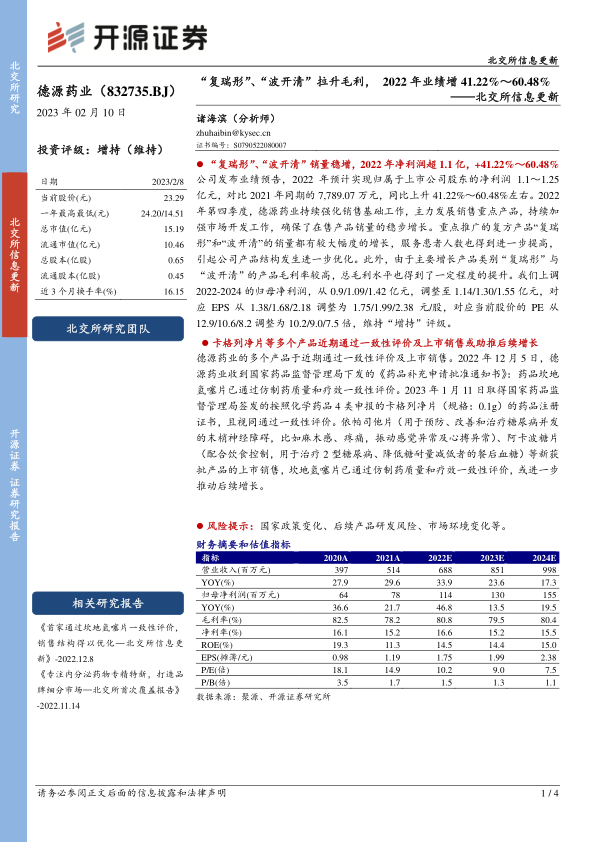 公司发布业绩预告,2022年预计实现归属于上市公司股东的净利润1.1~1.25亿元,对比2021年同期的7,789.07万元,同比上升41.22%~60.48%左右。2022年第四季度,德源药业持续强化销售基础工作,主力发展销售重点产品,持续加强市场开发工作,确保了在售产品销量的稳步增长。重点推广的复方产品“复瑞彤”和“波开清”的销量都有较大幅度的增长,服务患者人数也得到进一步提高,引起公司产品结构发生进一步优化。此外,由于主要增长产品类别“复瑞彤”与“波开清”的产品毛利率较高,总毛利水平也得到了一定程度的提升。我们上调2022-2024的归母净利润,从0.9/1.09/1.42亿元,调整至1.14/1.30/1.55亿元,对应EPS从1.38/1.68/2.18调整为1.75/1.99/2.38元/股,对应当前股价的PE从12.9/10.6/8.2调整为10.2/9.0/7.5倍,维持“增持”评级。