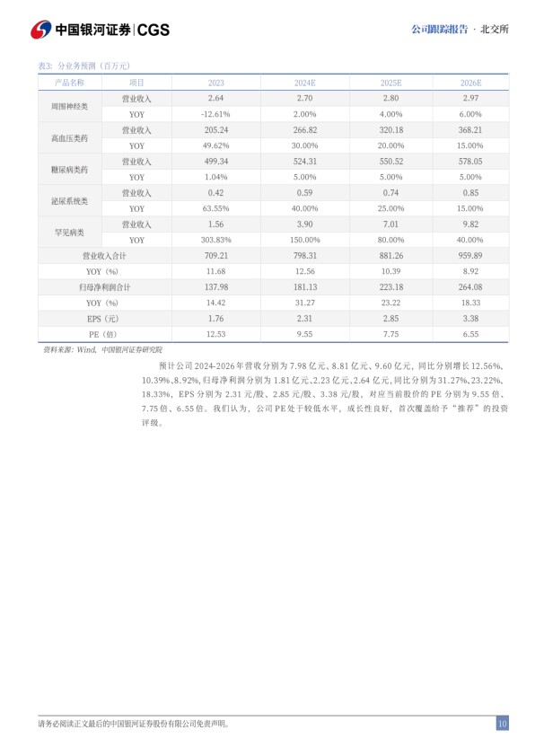 产品聚焦高毛利的糖尿病和高血压等慢性病药物,业绩稳健增长:公司主要产品按照治疗领域可以分为糖尿病类、高血压类、周围神经类、罕见病类、泌尿系统类。糖尿病类收入占比最大,2023年实现营业收入4.99亿元,占比70.41%,产品复瑞彤销量保持较好增长,依帕司他片、阿卡波糖片及新获批上市产品卡格列净片和恩格列净片共同推动了该板块的增长;高血压类的拳头产品坎地氢噻片2022年11月全国首家通过一致性评价,效果良好获市场普遍认可,展现出良好的市场潜力,该类产品2023年实现营业收入2.05亿元,占比28.94%,同比增长49.62%,近三年年均复合增长率达到59.51%。