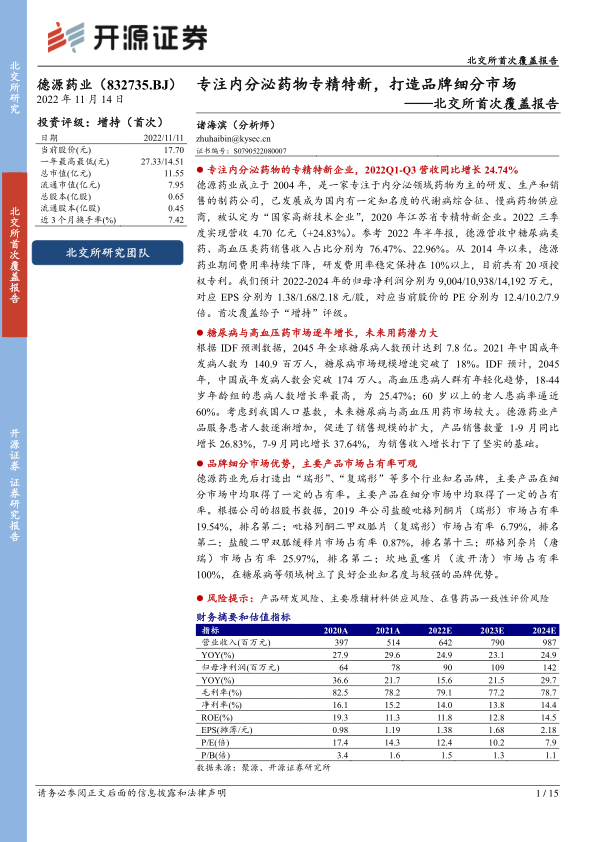 德源药业成立于2004年,是一家专注于内分泌领域药物为主的研发、生产和销售的制药公司,已发展成为国内有一定知名度的代谢病综合征、慢病药物供应商,被认定为“国家高新技术企业”,2020年江苏省专精特新企业。2022三季度实现营收4.70亿元(+24.83%)。参考2022年半年报,德源营收中糖尿病类药、高血压类药销售收入占比分别为76.47%、22.96%。从2014年以来,德源药业期间费用率持续下降,研发费用率稳定保持在10%以上,目前共有20项授权专利。我们预计2022-2024年的归母净利润分别为9,004/10,938/14,192万元,对应EPS分别为1.38/1.68/2.18元/股,对应当前股价的PE分别为12.4/10.2/7.9倍。首次覆盖给予“增持”评级。