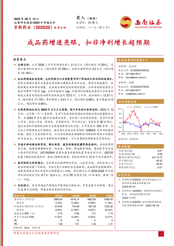 京新药业2024年上半年业绩表现亮眼,成品药业务增长迅速,盈利能力有所提升。首个创新药地达西尼的上市以及创新管线的持续推进为公司未来发展注入了新的动力。维持“买入”评级,但需关注非经常损益、研发进展、商业化进展以及带量采购政策等风险因素。