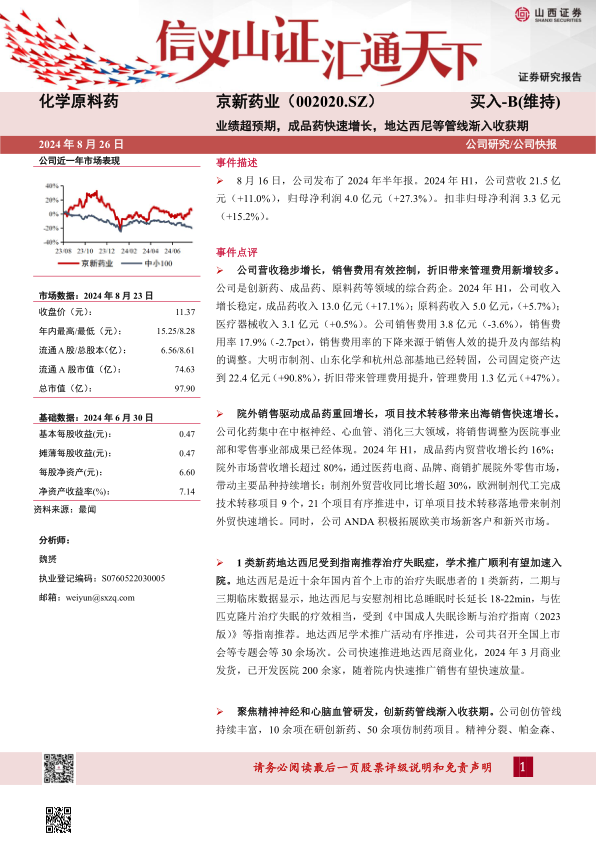 基于公司2024年上半年的强劲业绩表现和未来发展潜力,分析师维持对京新药业的“买入-B”评级。分析师认为,公司成品药业务已恢复增长态势,而创新药地达西尼的上市和推广有望带来高速增长。