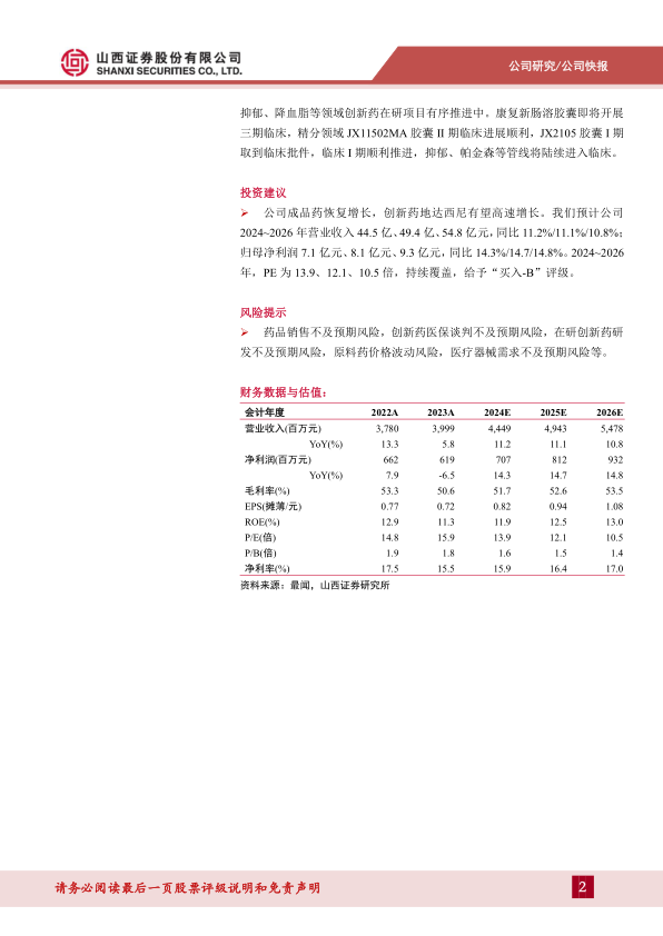 公司成品药恢复增长,创新药地达西尼有望高速增长。我们预计公司2024~2026年营业收入44.5亿、49.4亿、54.8亿元,同比11.2%/11.1%/10.8%;归母净利润7.1亿元、8.1亿元、9.3亿元,同比14.3%/14.7/14.8%。2024~2026年,PE为13.9、12.1、10.5倍,持续覆盖,给予“买入-B”评级。