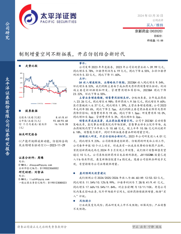 本报告对京新药业2023年的经营业绩进行了全面分析,认为公司在制剂业务方面具有增长潜力,并通过销售改革和市场拓展,有望进一步提升业绩。同时,公司持续投入研发,积极转型为仿创结合的创新型药企,首款创新药的上市销售将为公司带来新的增长点。基于以上分析,报告预测了公司未来三年的收入和利润增长,并维持“买入”评级。
