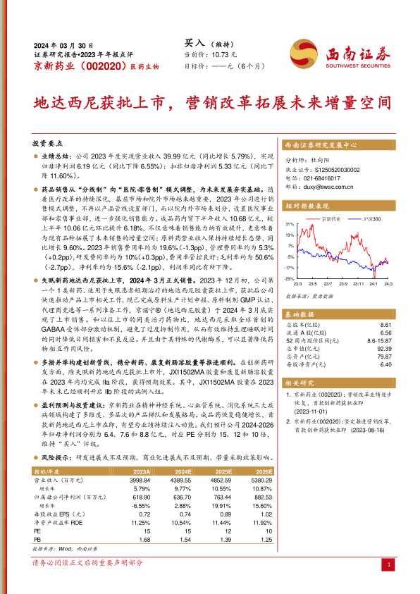 本报告分析了京新药业2023年年报,指出公司通过调整销售模式、推出新药地达西尼等举措,有望在未来实现业绩增长。维持“买入”评级,但提醒投资者关注研发、商业化及政策风险。