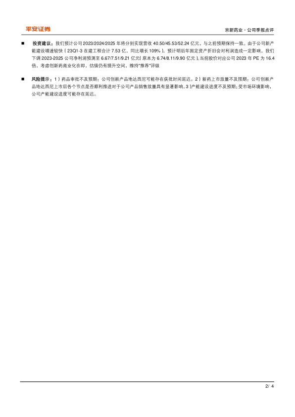 风险提示:1)药品审批不及预期:公司创新产品地达西尼可能存在获批时间延迟。2)新药上市放量不及预期:公司创新产品地达西尼上市后各个节点是否顺利推进对于公司产品销售放量具有显著影响。3)产能建设进度不及预期:受市场环境影响,公司产能建设进度可能存在延迟。