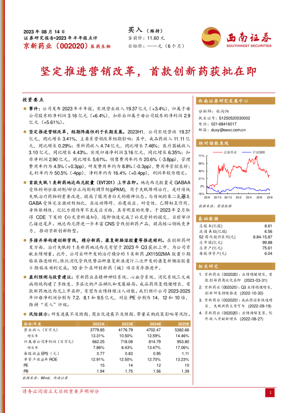 本报告对京新药业2023年半年报进行了全面分析,指出公司坚定推进营销改革,首款创新药上市在即,有望为公司带来新的增长动力。同时,公司在创新药研发方面持续投入,构建了多元化的产品管线。基于对公司未来业绩的预测,维持“买入”评级,但同时也提示了相关风险。
