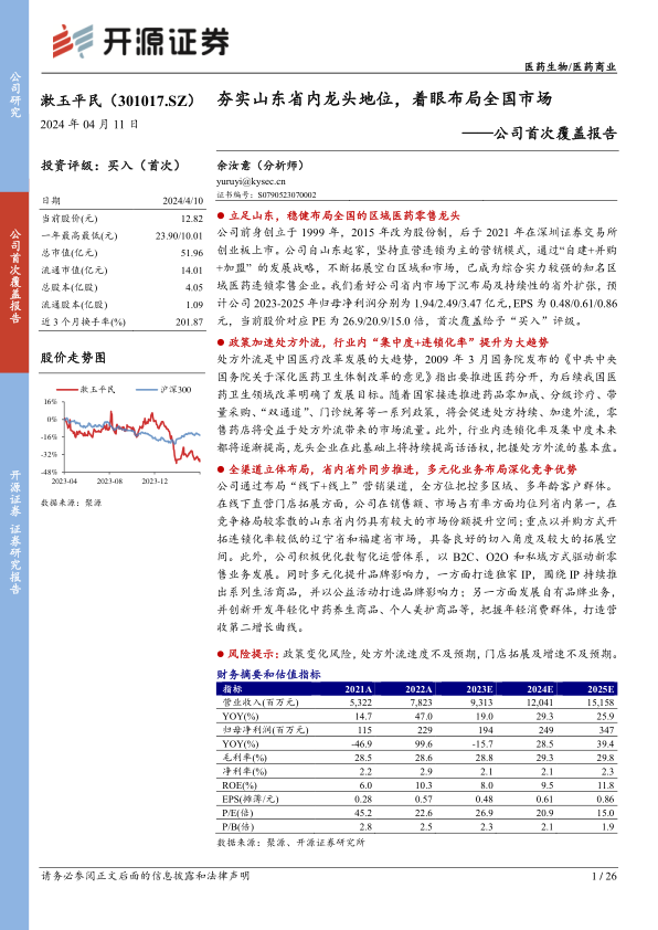 公司前身创立于1999年,2015年改为股份制,后于2021年在深圳证券交易所创业板上市。公司自山东起家,坚持直营连锁为主的营销模式,通过“自建+并购+加盟”的发展战略,不断拓展空白区域和市场,已成为综合实力较强的知名区域医药连锁零售企业。我们看好公司省内市场下沉布局及持续性的省外扩张,预计公司2023-2025年归母净利润分别为1.94/2.49/3.47亿元,EPS为0.48/0.61/0.86元,当前股价对应PE为26.9/20.9/15.0倍,首次覆盖给予“买入”评级。