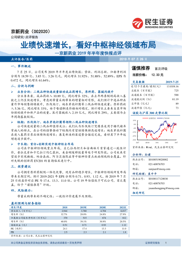 京新药业2019年半年度快报点评:业绩快速增长,看好中枢神经领域布局