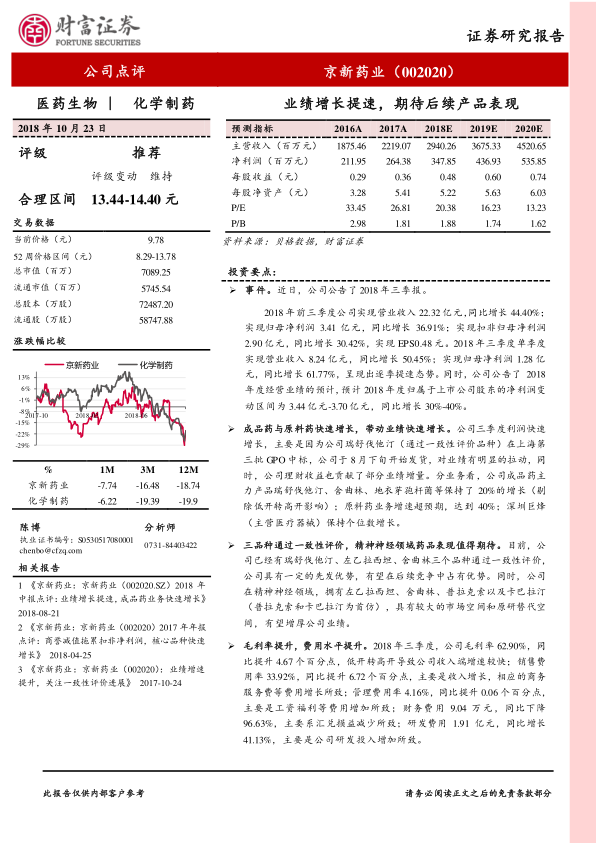 京新药业2018年三季报业绩表现亮眼,主要得益于瑞舒伐他汀等核心产品的市场拓展和原料药业务的快速增长。公司在一致性评价和精神神经领域具有较强的竞争优势和增长潜力。报告维持对公司的“推荐”评级,但同时也提示了相关风险。总体来看,京新药业未来的发展值得期待。