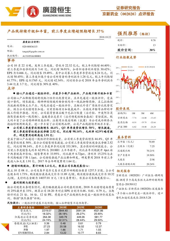 京新药业发布的三季度报告显示业绩超预期增长,核心产品通过一致性评价,新产品不断获批,产品线持续升级和丰富。公司前三季度营收和净利润大幅增长,现金流良好,并持续回购股权,彰显长期发展信心。维持“强烈推荐”评级,但需注意一致性评价进展和核心品种销售等风险。