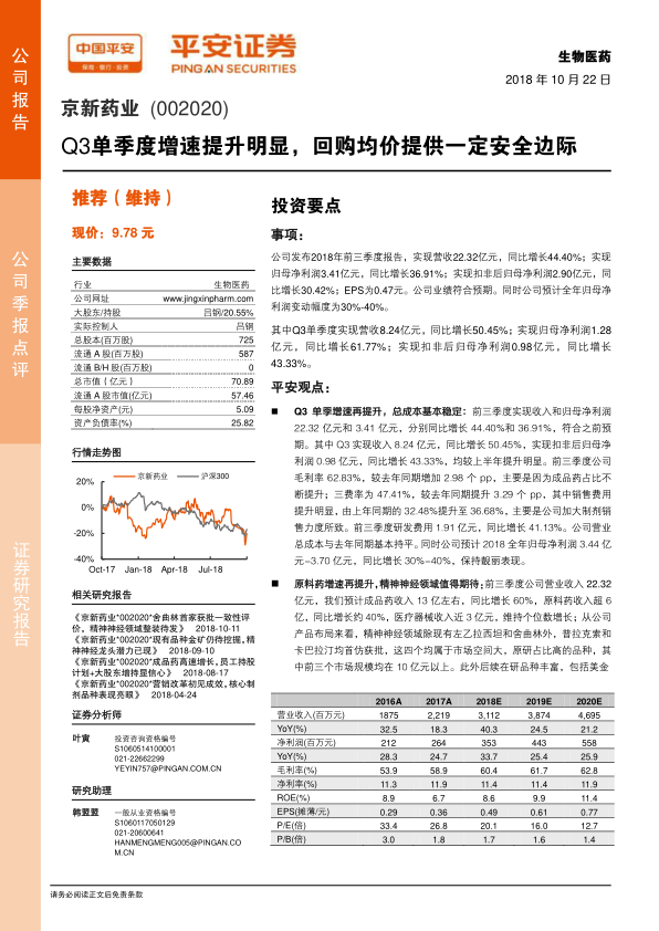 京新药业2018年前三季度业绩表现强劲,特别是第三季度单季度的营收和归母净利润增速显著,显示出公司强大的增长动力。这主要得益于成品药销售的快速增长和精神神经领域产品的丰富布局。公司通过股票回购和员工持股计划,不仅为股价提供了安全边际,也进一步增强了市场信心和内部活力。尽管面临研发、成本和政策等行业风险,但公司凭借其稳健的基本面、清晰的战略规划以及当前较低的估值水平,具备较高的投资价值,维持“推荐”评级。