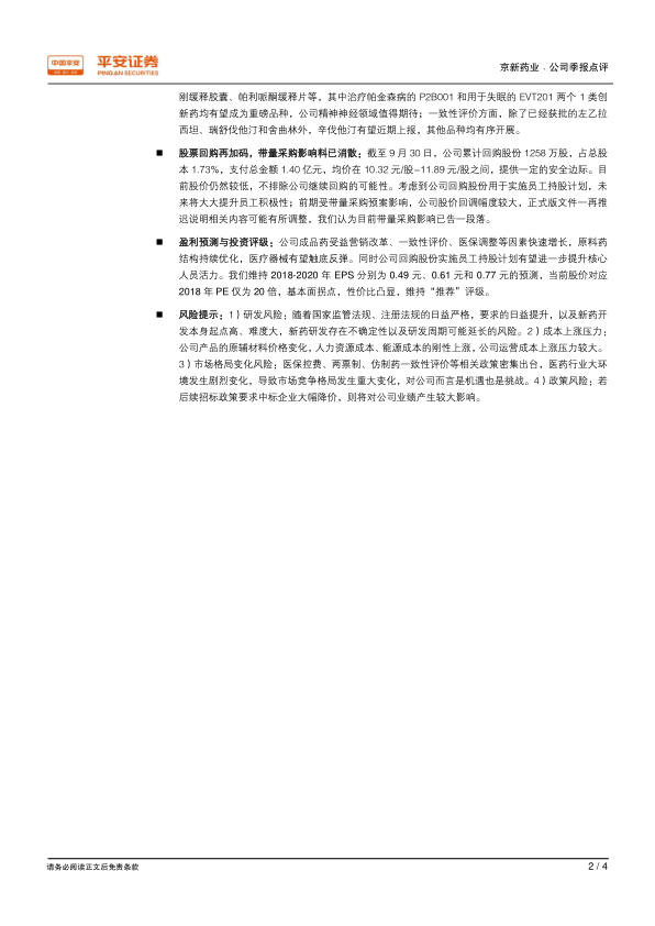 同时,报告也提示了潜在风险:包括研发活动的不确定性及周期延长风险;原辅材料、人力资源和能源成本上涨带来的成本压力;医保控费、两票制、仿制药一致性评价等政策密集出台导致的市场竞争格局变化风险;以及若后续招标政策要求中标企业大幅降价可能对公司业绩产生较大影响的政策风险。