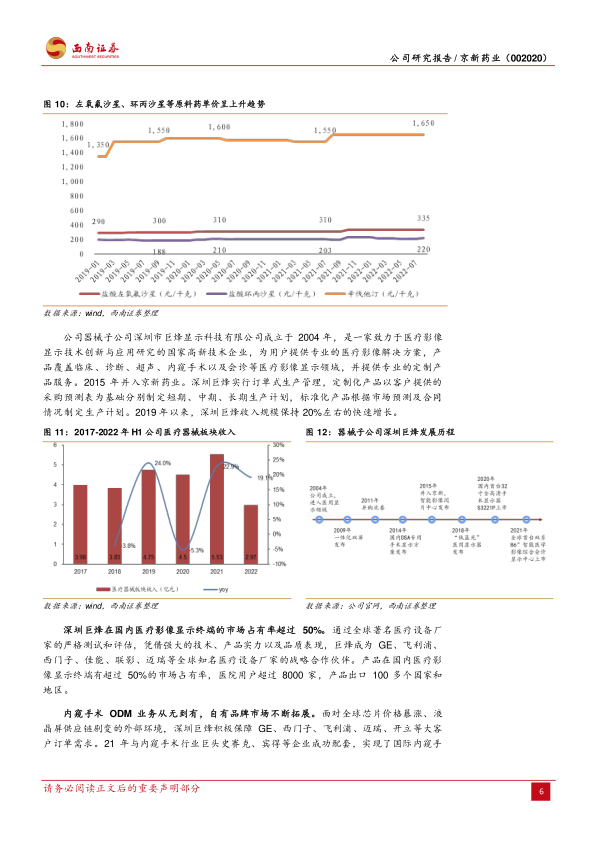 医疗器械子公司深圳巨烽自2015年并入京新药业以来,收入规模保持20%左右的快速增长。该公司是国家高新技术企业,为用户提供专业的医疗影像解决方案,产品覆盖临床、诊断、超声、内窥手术以及会诊等领域。深圳巨烽在国内医疗影像显示终端市场占有率超过50%,医院用户超过8000家,产品出口100多个国家和地区。2021年,公司成功与史赛克、宾得等内窥手术行业巨头配套,实现了国际内窥手术ODM业务的突破。