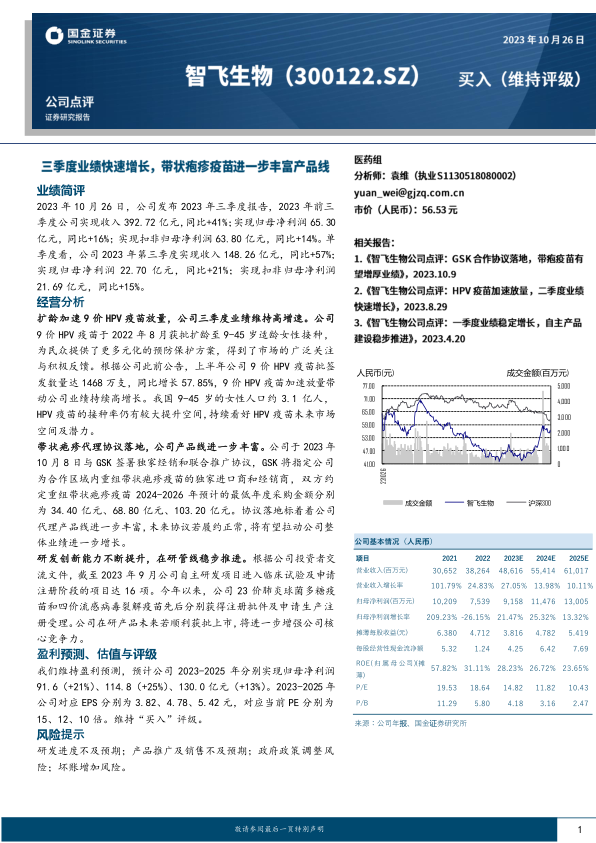 本报告分析显示,智飞生物在2023年前三季度展现出强劲的业绩增长势头,特别是第三季度收入和利润均实现高增长。这主要得益于9价HPV疫苗扩龄后的市场放量,该疫苗批签发量大幅增长,且在庞大的适龄女性人口中仍有巨大的渗透空间。同时,公司通过与GSK达成重组带状疱疹疫苗的独家代理协议,成功拓展了产品线,预计未来三年将带来数十亿级的采购金额,为业绩增长注入新动力。在自主研发方面,公司亦取得显著进展,多款疫苗进入临床或注册阶段,预示着未来核心竞争力的进一步增强。综合来看,公司盈利预测积极,市场前景广阔,维持“买入”评级,但需关注研发进度、产品推广及政策调整等潜在风险。