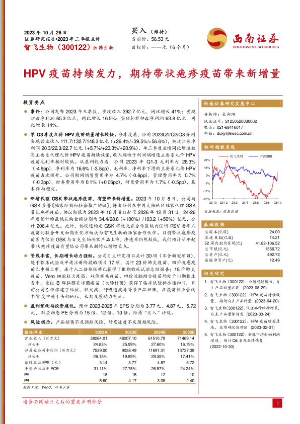 本报告分析了智飞生物2023年三季报,指出九价HPV疫苗是业绩增长的主要驱动力,但毛利率有所下降。公司独家代理GSK带状疱疹疫苗有望成为新的增长点。公司自主研发管线丰富,长期发展动力充足。维持“买入”评级,但需关注产品销售和研发进度风险。