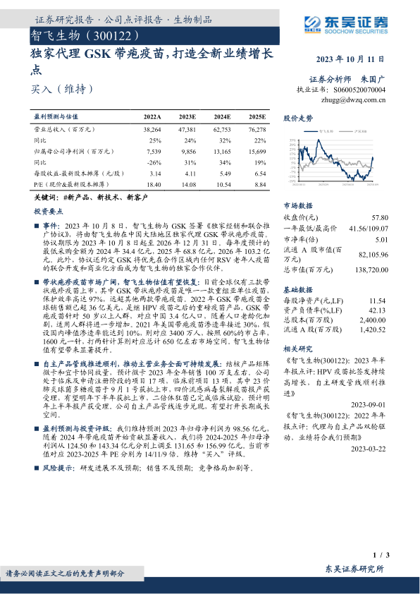 报告维持对智飞生物2023年归母净利润98.56亿元的预测。鉴于GSK带状疱疹疫苗将从2024年开始贡献显著收入,报告将2024年和2025年的归母净利润预测分别从原先的124.50亿元和143.34亿元上调至131.65亿元和156.99亿元。根据最新预测,当前市值对应2023-2025年的P/E分别为14倍、11倍和9倍。