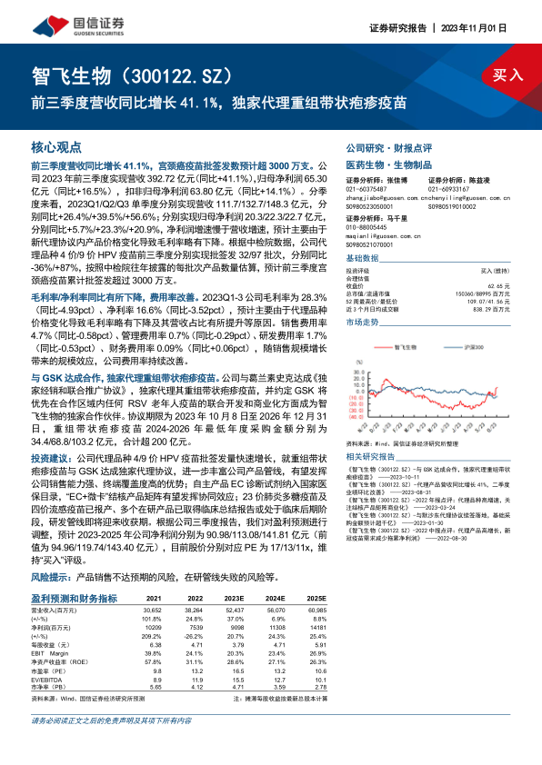 维持对智飞生物的“买入”评级,并根据公司三季度报告对盈利预测进行了调整,看好公司未来的发展前景。