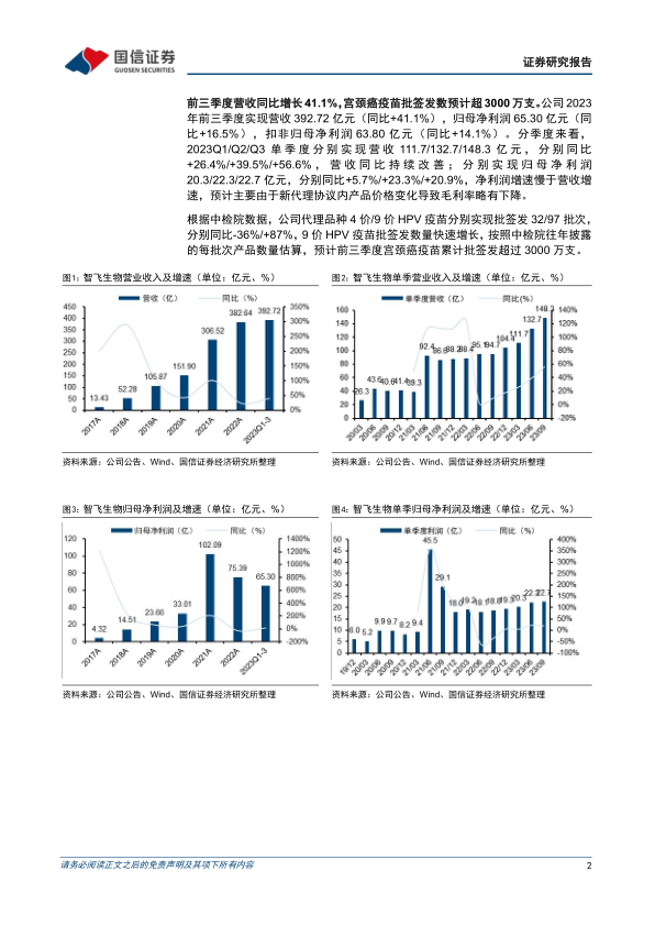 本报告分析了智飞生物2023年前三季度的财务业绩,指出公司营收同比增长显著,但净利润增速略低于营收增速,主要受代理产品价格变化影响。
