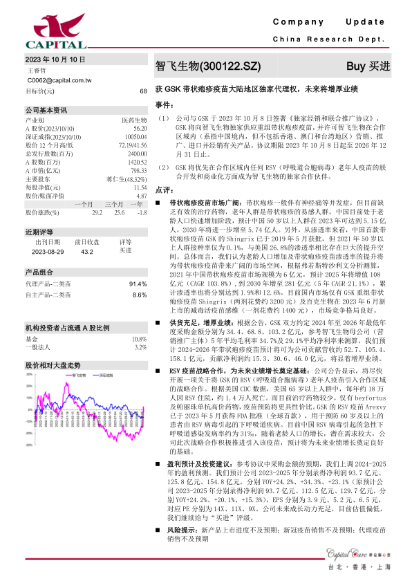 本报告分析了智飞生物与GSK的合作,认为公司获得GSK带状疱疹疫苗的独家代理权将显著增厚业绩,同时与GSK在RSV疫苗领域的战略合作也将为公司未来的业绩增长奠定基础。报告上调了公司2024-2025年的盈利预测,并维持“买进”评级。但同时也提示了新产品上市进度、新冠疫苗和代理疫苗销售不及预期的风险。