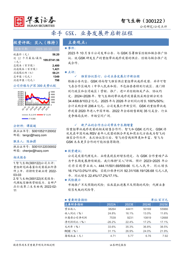 2023年10月9日公司发布公告,与GSK签署独家经销和联合推广协议,就GSK研发生产的重组带状疱疹疫苗的供应、经销与联合推广达成合作。