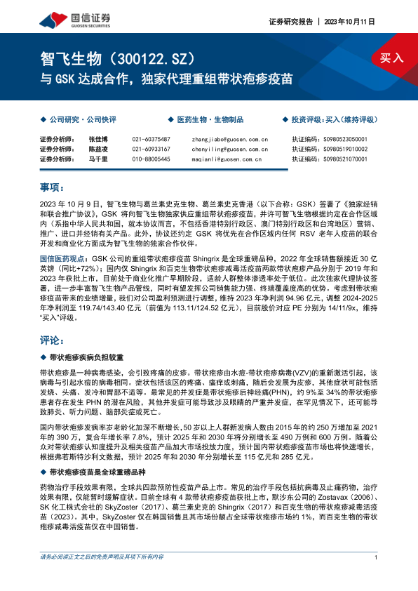 国信医药观点: GSK 公司的重组带状疱疹疫苗 Shingrix 是全球重磅品种, 2022 年全球销售额接近 30 亿英镑(同比+72%); 国内仅 Shingrix 和百克生物带状疱疹减毒活疫苗两款带状疱疹产品分别于 2019 年和2023 年获批上市, 目前处于商业化推广早期阶段, 适龄人群整体渗透率处于低位。 此次独家代理协议签署, 进一步丰富智飞生物产品管线, 同时有望发挥公司销售能力强、 终端覆盖度高的优势。 考虑到带状疱疹疫苗带来的业绩增量, 我们对公司盈利预测进行调整, 维持 2023 年净利润 94.96 亿元, 调整 2024-2025年净利润至 119.74/143.40 亿元(前值为 113.11/124.52 亿元), 目前股价对应 PE 分别为 14/11/9x, 维持“买入”评级。