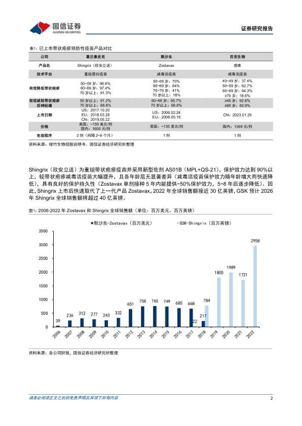 国内目前仅有两款带状疱疹疫苗上市, 其中 GSK 的重组带状疱疹疫苗 Shingrix(欣安立适) 于 2019 年 5月获批附条件上市, 百克生物的带状疱疹减毒活疫苗于 2023 年 1 月获批。