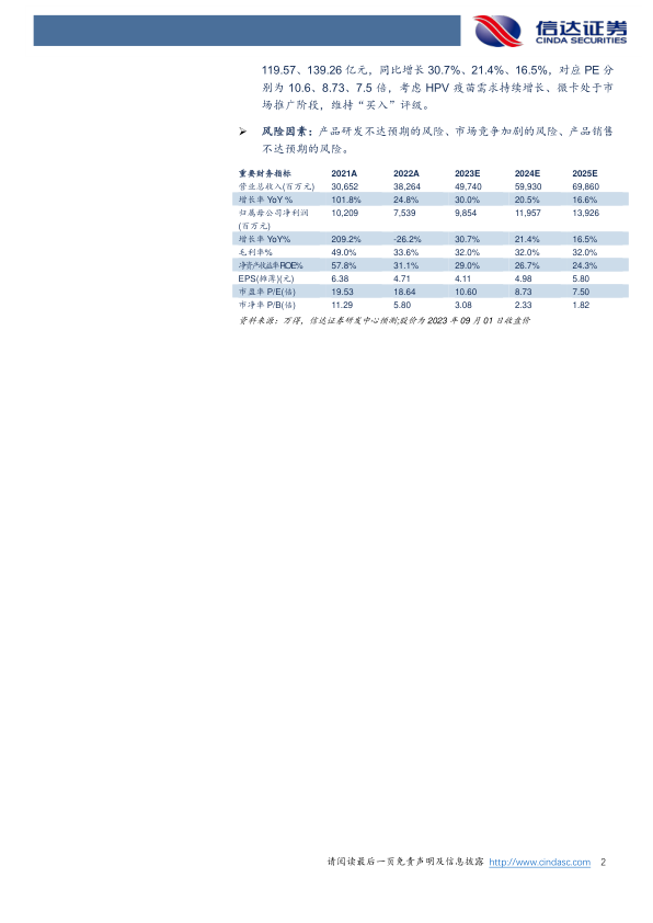 盈利预测与投资评级:我们预计公司2023-2025年实现收入497.4、599.3、698.6亿元,同比增长30%、20.5%、16.6%,归母净利润98.54、119.57、139.26亿元,同比增长30.7%、21.4%、16.5%,对应PE分别为10.6、8.73、7.5倍,考虑HPV疫苗需求持续增长、微卡处于市场推广阶段,维持“买入”评级。