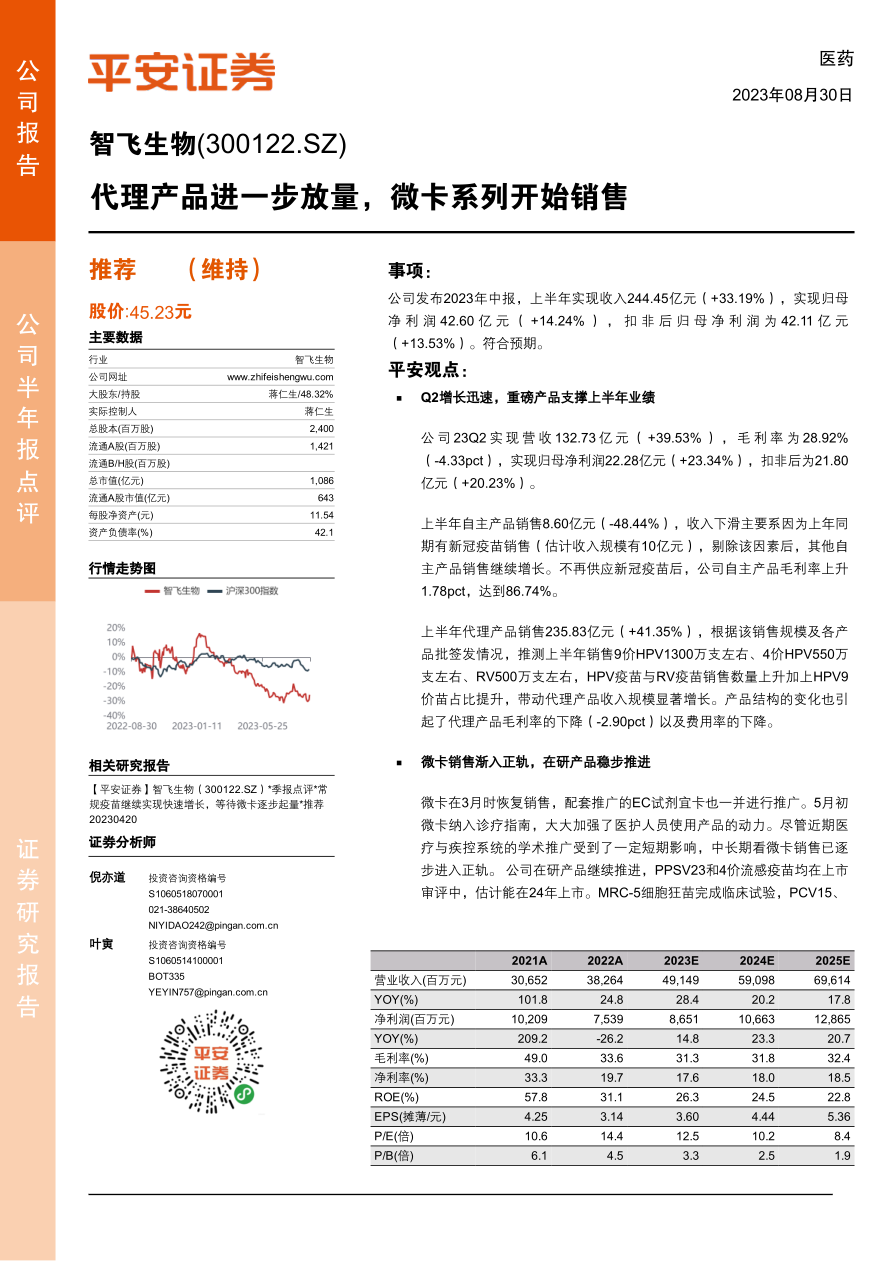 智飞生物2023年中报显示,公司通过代理产品的强劲销售和产品结构的优化实现了营收和利润的双增长。虽然自主产品销售受到新冠疫苗影响有所下滑,但剔除该因素后仍保持增长势头。微卡销售逐步进入正轨,在研产品稳步推进,为公司未来的业绩增长提供了动力。平安证券维持对智飞生物的“推荐”评级,但同时也提示了新品上市、产品推广与生产以及行业风险。