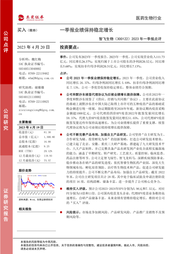 智飞生物一季报业绩稳健增长,未来发展潜力巨大