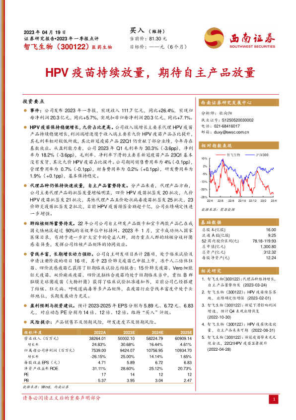 智飞生物2023年一季报显示,公司收入和利润均实现增长,主要得益于HPV疫苗的持续放量。尽管九价HPV疫苗占比提升导致毛利率有所下降,但代理产品的稳健增长以及自主研发产品的逐步上市,为公司未来的发展提供了强劲动力。