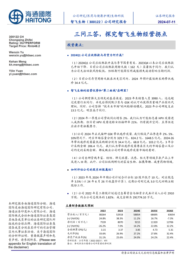 报告评估了智飞生物的财务表现,指出2024年第一季度应收账款和存货的升高与季节性因素及新产品采购有关,但公司应收账款周转天数显著低于同行,回款风险较低。同时,公司通过持续的现金分红、股份回购注销以及员工持股计划等多种方式,积极回馈股东,展现了良好的股东回报属性。尽管面临HPV疫苗营收下滑等风险,公司通过多维度战略布局,有望维持其市场“优于大市”的评级。