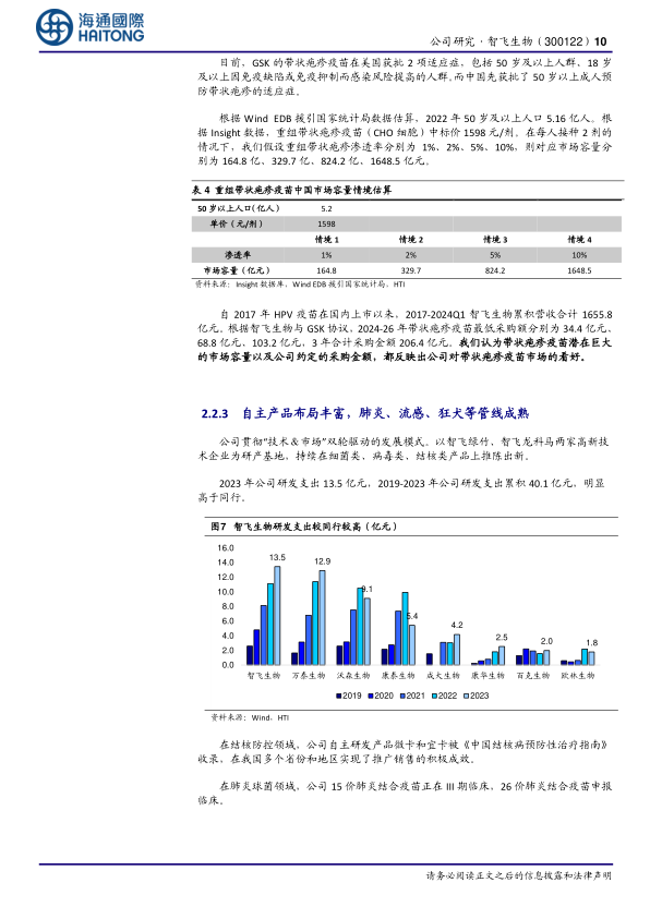 (1)公司拥有强大且领先的基层渠道,2023年末销售人员3990人,远远超过疫苗行业同行,并先后得到默沙东与GSK的认可而获得其重磅产品国内代理权。同时,公司坚持“技术&市场”的双轮驱动模式,2023年公司研发支出13.5亿元,明显高于同行。
