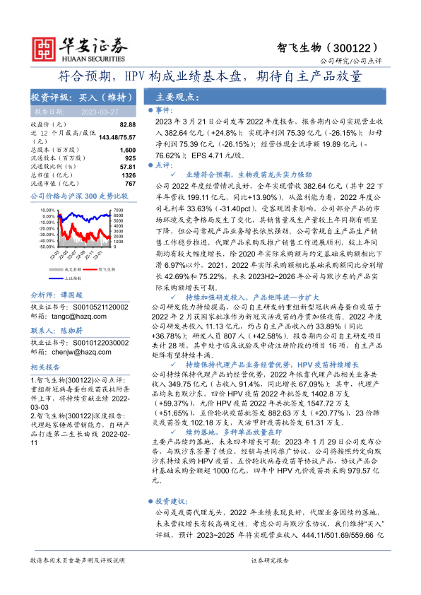公司是疫苗代理龙头,2022年业绩表现良好,代理业务因续约落地,未来营收增长有较高确定性。考虑公司与默沙东协议,我们维持“买入”评级,预计2023~2025年将实现营业收入444.11/501.69/559.66亿元,同比增长16.1%/13.0%/11.6%;实现归母净利润92.31/107.92/126.40亿元,同比增长22.4%/16.9%/17.1%。