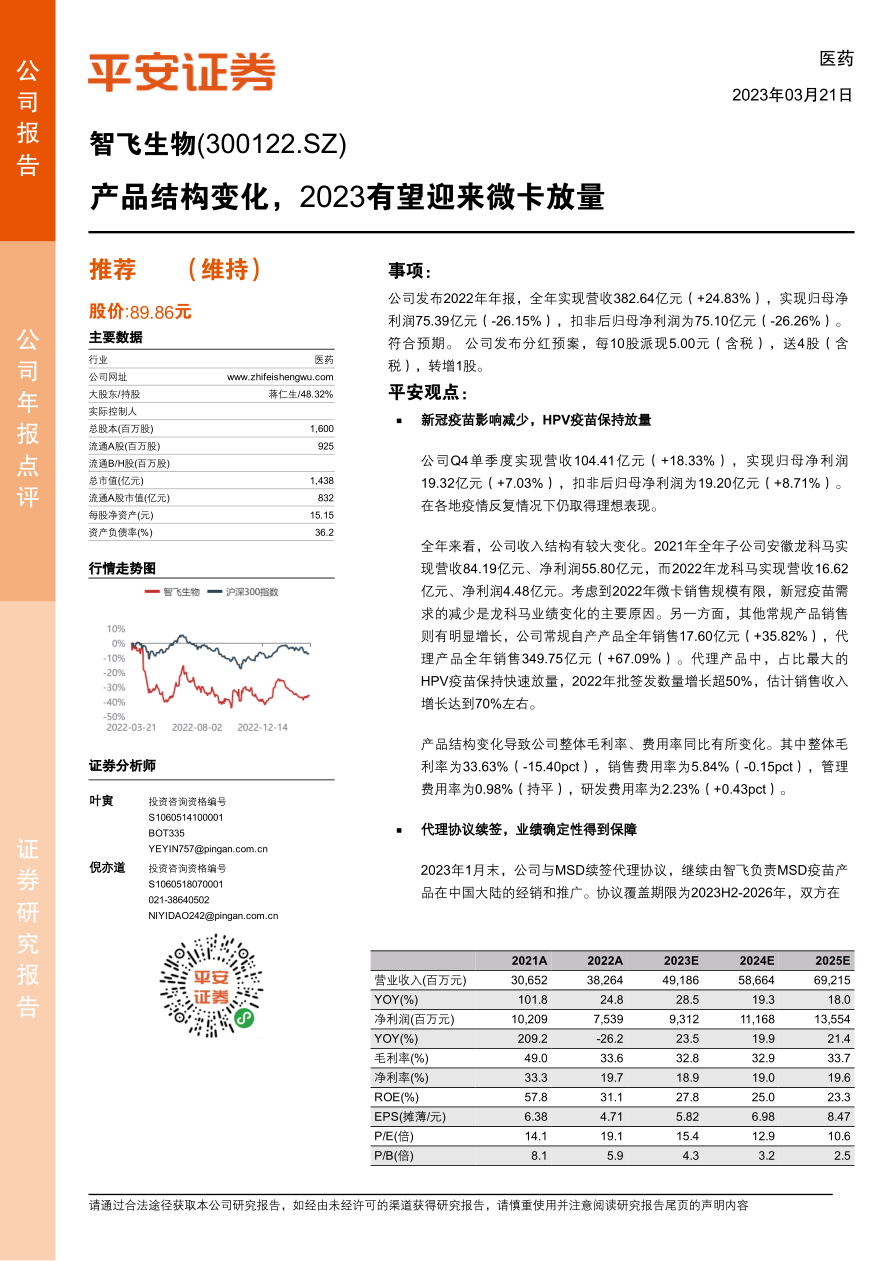 本报告分析了智飞生物2022年年报,指出新冠疫苗影响减弱导致公司收入结构发生变化,但HPV疫苗等代理产品保持快速放量。公司与MSD续签代理协议,为未来业绩提供了保障。随着疫情影响消退,微卡系列产品有望迎来放量良机。维持“推荐”评级,但需关注新品上市、产品推广以及行业负面事件等风险。