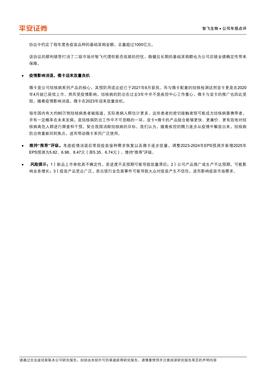 考虑疫情消退后常规疫苗接种需求恢复以及微卡逐步放量,调整2023-2024年EPS预测并新增2025年EPS预测为5.82、6.98、8.47元(原5.35、6.74元)。维持“推荐”评级。