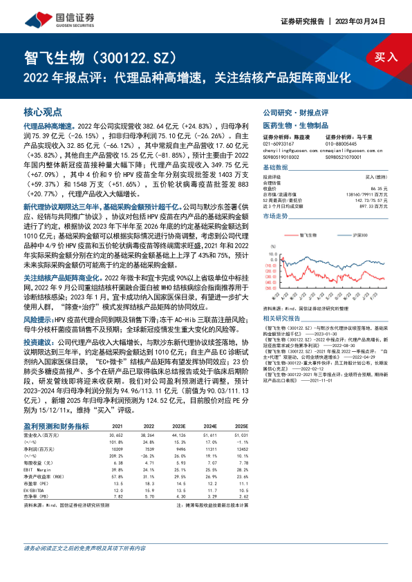 智飞生物2022年业绩表现出代理产品强劲增长的特点,尤其是在HPV疫苗和五价轮状病毒疫苗的推动下,公司营收实现显著提升。尽管受新冠疫苗需求下降影响,归母净利润有所承压,但常规自主产品仍保持增长。公司与默沙东续签的三年半代理协议,锁定了未来超千亿的基础采购金额,为公司提供了长期稳定的业绩保障,且历史采购数据表明实际采购额有望持续超出预期。同时,公司在研发方面持续投入,拥有丰富的自主研发管线,多个产品已进入临床后期或报产阶段,特别是结核产品矩阵的商业化进展,有望为公司带来新的增长点。综合来看,智飞生物凭借其强大的代理产品线、稳固的合作关系以及日益成熟的自主研发管线,具备持续增长的潜力,维持“买入”评级。