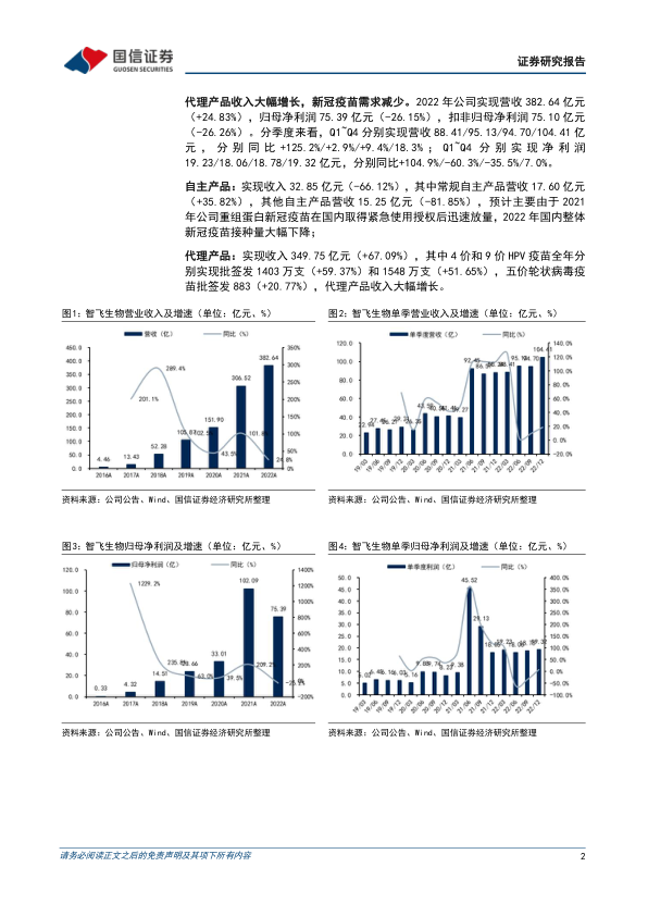 2022年,智飞生物实现营业收入382.64亿元,同比增长24.83%;归母净利润75.39亿元,同比下降26.15%;扣非归母净利润75.10亿元,同比下降26.26%。净利润下降主要受新冠疫苗需求减少影响。