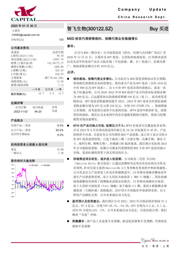 公司新冠二代苗 ZF2202(Omicron-Delta 嵌合疫苗)已通过前期研究证明具有良好的安全性及有效性,针对目前主流的Omicron BA.4/5变异株有更高的中和抗体滴度。公司其余自主产品研发工作也在积极推进中,23价肺炎球菌多糖疫苗申请生产注册获得受理,冻干人用狂犬病疫苗( MRC-5 细胞)、四价流感病毒裂解疫苗获得了Ⅲ期临床试验总结报告,15价肺炎球菌结合疫苗、冻干人用狂犬病疫苗(Vero 细胞)处于临床III期,重组B群脑膜炎球菌疫苗(大肠杆菌)获批临床、治疗用卡介苗临床申请获得受理。自主研发产品梯队完善,公司未来成长动力充足。