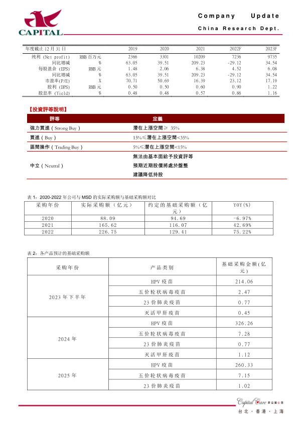 公司此次与MSD续签采购协议符合预期,将保障代理销售业务持续增长。续约重点产品为HPV疫苗(合约1010亿中有980亿为HPV疫苗),自4/9价HPV疫苗在国内获批后,需求一直处于旺盛态势,公司2020-2022年对MSD疫苗产品合约的实际采购金额为480亿元,已远超原协议的基础采购额340亿元。此次续签采购协议,HPV疫苗采购量继续提升2023、2024年HPV疫苗合约预估基础采购金额分别为287亿元和326亿元,分别YOY+27%和17%,基础增量已有保障,而考虑到目前供不应求的局面、HPV9适用年龄的扩充、疫情管控的放松,我们认为未来两年仍存在超额采购的可能性,将助力短期销售实现高速增长。