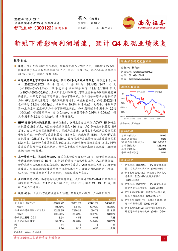 本报告分析了智飞生物(300122)2022年三季报,核心观点如下: