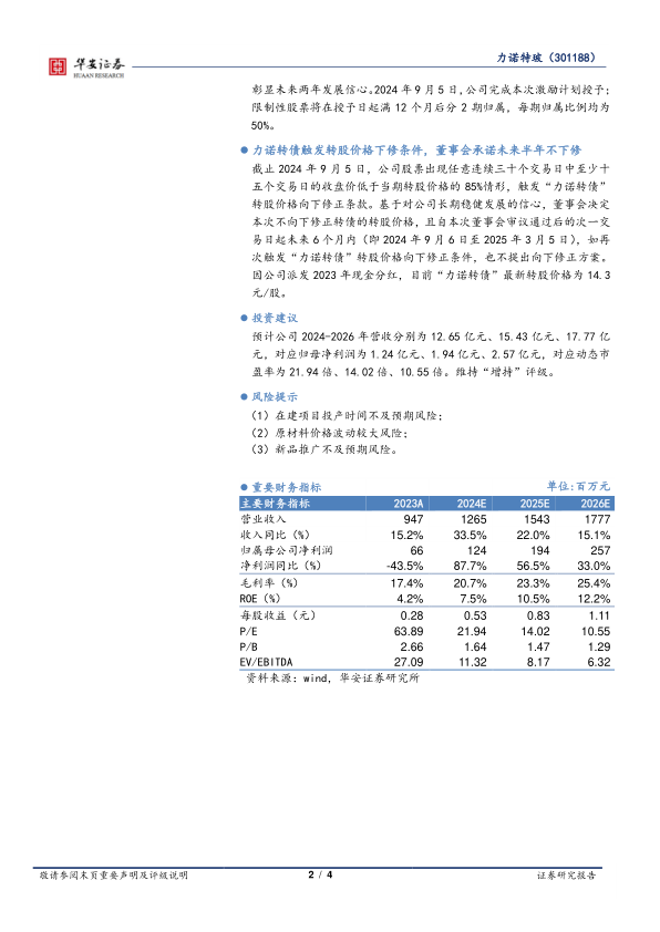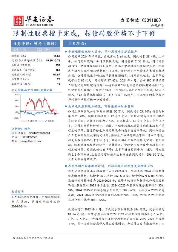 力诺特玻通过中硼硅模制瓶转A成功和多个募投项目的投产,实现了营收的增长和业务的扩张。成本控制和效率提升推动了盈利能力的修复,但可转债的利息支出对财务费用产生了一定影响。公司推出限制性股票激励计划,彰显了对未来发展的信心,但同时也面临着转债价格调整的挑战。维持“增持”评级,但需关注在建项目投产时间、原材料价格波动和新品推广等风险。
