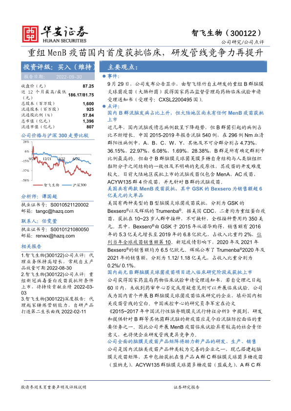 9月29日,公司发布公告显示,由智飞绿竹自主研发的重组B群脑膜炎球菌疫苗(大肠杆菌)获得国家药品监督管理局药物临床试验申请受理通知书(受理号:CXSL2200495国)。