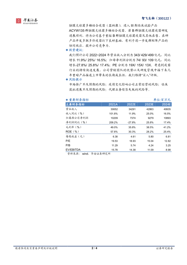 我们预计公司2022~2024年营业收入分别为343/429/499亿元,同比增长11.9%/25%/16.5%;归母净利润分别为74/93/109亿元,同比增长-27.8%/25.8%/17.4%;PE分别为19X/15X/13X。考虑到疫苗行业的持续快速发展、公司营销团队的优势以及研发管线中接下来几年重磅产品接连上市带来的长期成长性,我们维持“买入”评级。