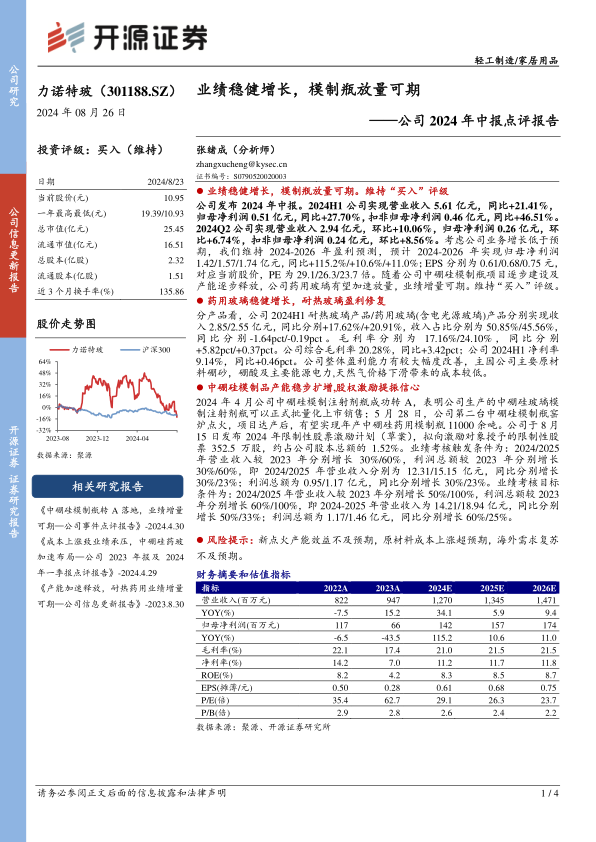 本报告总结了力诺特玻(301188.SZ)2024年中报,指出公司业绩稳健增长,尤其是在药用玻璃领域。尽管公司业务增长略低于预期,但维持“买入”评级,并强调随着中硼硅模制瓶项目的推进,公司业绩有望加速增长。