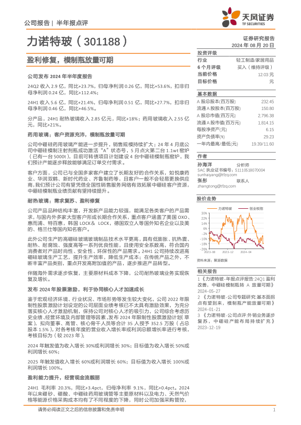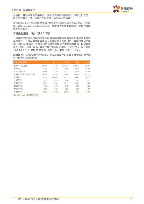 一致性评价政策及国家药品集中带量采购政策推动中硼硅药用玻璃渗透率快速提升,公司中硼硅模制瓶转A及募投项目陆续投产,有望打开成长空间。根据24年中报,以及考虑可转债产能释放节奏及利息费用,我们调整盈利预测,预计24-26年公司归母净利分别为1.5/2.2/2.8亿(前值1.7/2.2/2.8亿),对应PE分别为19/13/10X,维持“买入”评级。